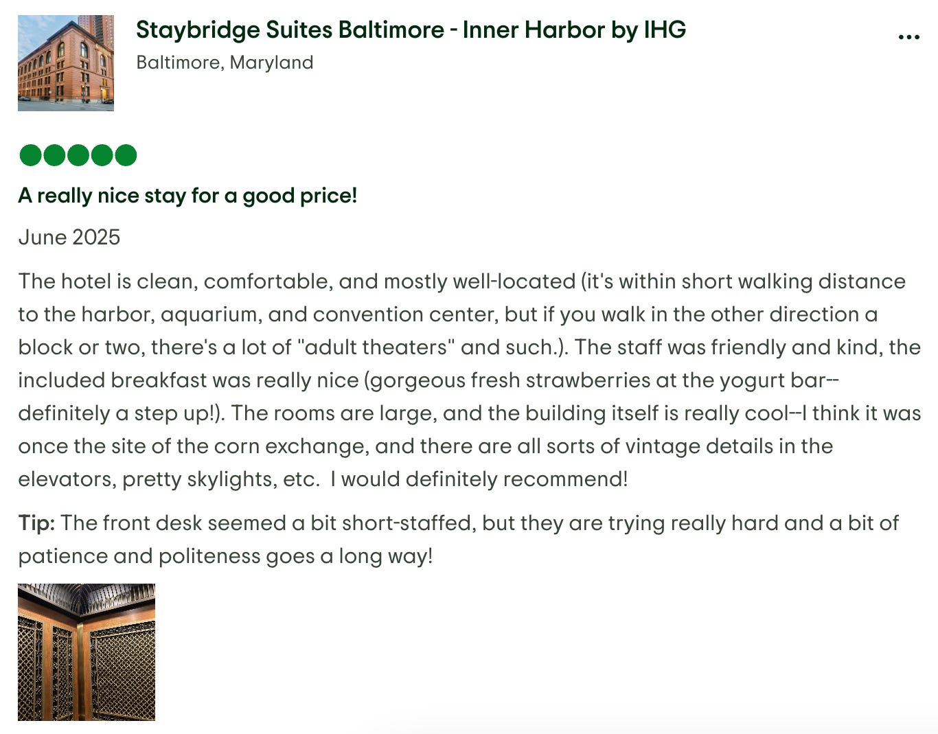 I really want to write more positive or even moderate reviews: I also know that people are so quick to leave eviscerating reviews when they are unhappy about something, and those reviews can tank a business’s standings for years to come, even if the complaint is completely irrelevant for a future stay (“The other guests at the pool had an unruly toddler. One star!”) or beyond the control of the business (“I couldn’t find parking anywhere because the town was having some sort of parade, so I can’t give the restaurant five stars even though the food was good.”) These troll-y reviews can be offset by positive reviews, even if they aren’t over-the-top effusive (“The diner was clean and my food came quickly.” “The museum has a nice little display of mammoth fossils; maybe not worth going out of your way for, but definitely interesting for an hour or two!”) It’s always easier to motivate people to complain than it is to get them to praise, but don’t we want to live in a world where we spend more of our time enjoying what went well, rather than focusing on what went wrong?